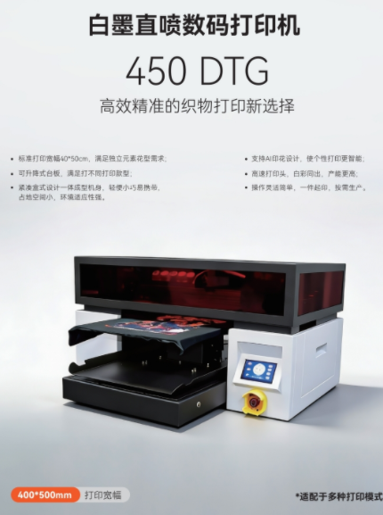 标准打印宽幅40*50cm,满足独立元素花型需求; 可升降式台板,满足打不同打印款型; 紧凑盒式设计一体成型机身,轻便小巧易携带, 占地空间小,环境适应性强。 支持AI印花设计,使个性打印更智能 高速打印头,白彩同出,产能更高; 操作灵活简单,一件起印,按需生产。