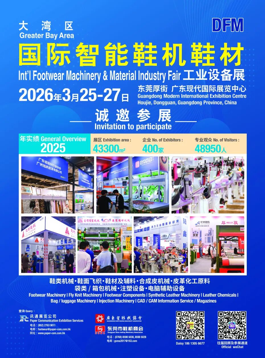 当前,全球鞋业市场规模持续增长,亚洲新兴市场消费升级加速,大湾区凭借产业集群与区位优势成为链接国内国际市场的核心枢纽,东南亚更成为鞋类产业转移与消费增长的核心潜力市场。对于福建鞋机鞋材企业而言,2026 DFM 展既是深耕大湾区本地市场的 “桥头堡”,更是开拓东南亚新兴市场的 “中转站”。无论是推广智能鞋机、创新鞋材产品,还是寻求湾区合作伙伴、对接东南亚采购资源,本届展会都是不可错失的核心平台。