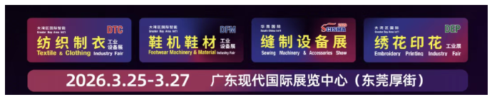 在这一产业变革节点,行业瞩目的第25届大湾区国际智能纺织制衣、鞋机鞋材工业设备展(2026DTC/DFM)、华南国际缝制设备展(SCISMA 2026)、大湾区国际绣花印花工业展(2026DEP)筹备进度再传捷报——展位去化率已突破90%!剩余黄金席位分秒递减,有志于抢占智能智造赛道、链接全球商机的企业,务必抓住最后参展机遇!