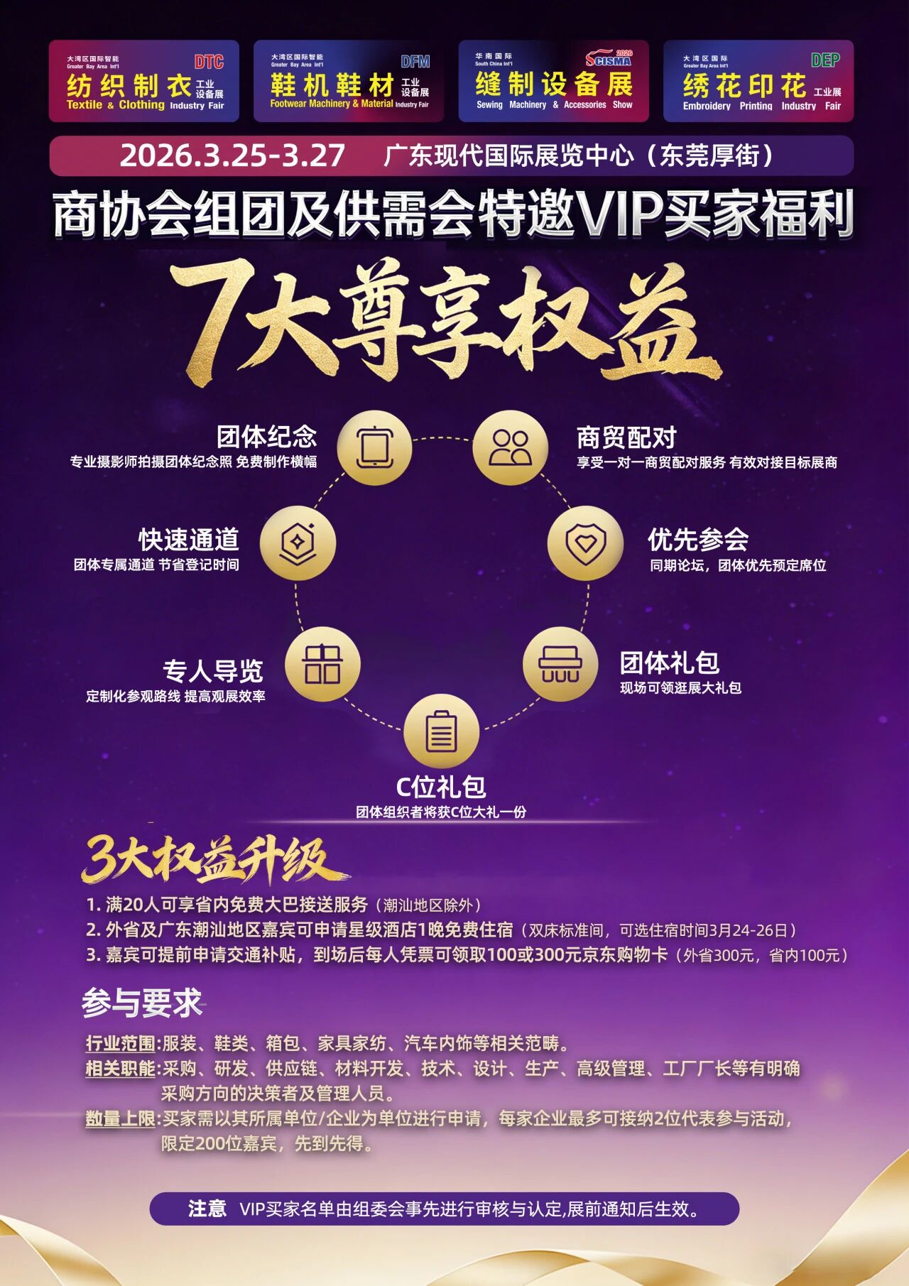 为最大化吸引海外优质买家群体,我们充分激活沉淀多年的行业品牌影响力与全球资源网络,构建了多维度、立体化的海外邀约体系:一方面,深度联动覆盖欧美、东南亚、中东、南美等核心纺织制衣鞋履市场的行业顶级展会、区域商贸活动,通过现场推广、合作宣传、买家资源互享等方式,精准触达当地有实际采购需求的生产商、批发商、品牌采购部等核心群体,将展会的核心亮点、展品范畴与商贸价值直接传递给目标买家;另一方面,主动对接各国驻粤领事馆商务处、海外重点商会及行业协会,定向邀约有对华采购计划的海外企业,同时通过定制化宣传资料、多语言推广渠道,让海外买家清晰了解展会的展品矩阵、优质展商阵容及高效的采购对接模式。 在邀约过程中,我们更注重 “前置对接、精准匹配” 的服务理念,力求让展商与海外买家的接洽更具效率与价值:针对意向明确的海外买家,我们安排专属对接团队,提前收集其采购需求(如产品类型、订单量级、技术参数等),并同步推送给对应的参展企业,助力双方在展会前完成初步沟通、锁定洽谈重点;对于有批量采购计划的海外采购团,我们提供一站式行程支持,包括展会入场绿色通道、现场洽谈专区预留、翻译服务协调等,确保买家在展会期间能集中精力与展商深度对接。 截至目前,我们的海外邀约工作已取得显著成效:通过多渠道推广与定向邀约,已吸引来自全球 10 + 大地区、20 + 个国家的优质海外买家群体高度关注,其中不乏来自意大利、印度、越南、巴西等纺织制衣鞋履产业集中地的知名采购商与品牌方;已有海外企业明确表达参展采购意向,不少买家已提前锁定展会行程,部分更是带着具体采购清单而来,期待在展会现场与中国优质展商达成合作、签订订单。 未来,我们将在保证中国市场买家、行业观众群体邀约力度不变基础上,针对性投入资源,优化邀约与对接服务,不断扩大买家数据库、深化与行业组织及商贸机构的合作,确保展会的买家质量与数量再创新高。让每一位参展企业都能借助展会平台,以最低的时间与差旅成本,对接最精准的商机,真正实现 “家门口的全球采购会”,为行业企业的全球市场拓展之路保驾护航。 2、2026首发,权益大升级 从青涩起步到行业标杆,我们的每一步成长,都离不开各大行业协会的信赖与鼎力支持。多为回馈这份沉甸甸的信赖,也为了与行业伙伴们并肩奔赴更广阔的未来,2026 年特别推出「七大尊享权益」—— 不仅延续往年的暖心权益,更针对商协会组团观展、供需会特邀 VIP 买家两大核心群体,对上年三大热门福利进行全方位升级,用更实在的权益、更贴心的服务、更精准的资源,解锁展会参与新体验!