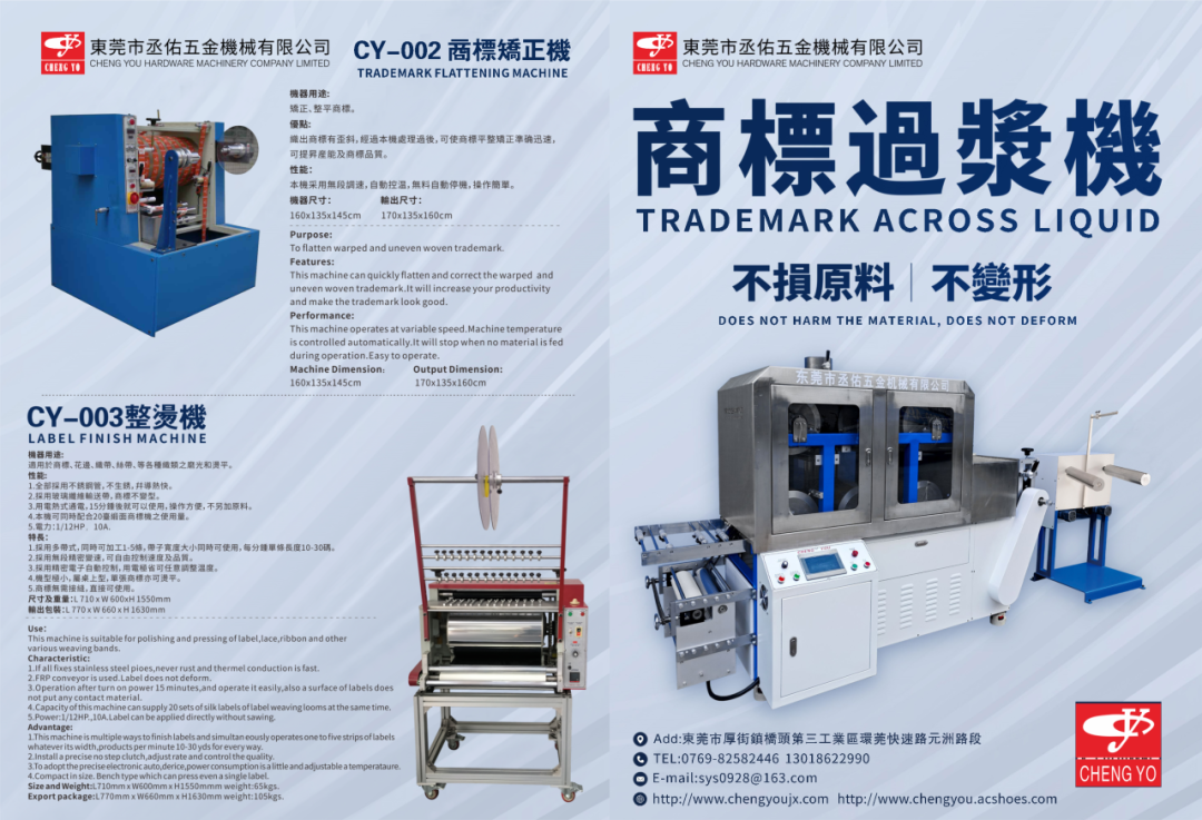 新阶段、新理念、新格局 BG01 星汇辰智能科技(苏州)有限公司 主营 熨烫设备,双面尼小烫机,无蒸汽小烫机,智能分缝机等等 EC28 东莞市丞佑五金机械有限公司 主营 商标过浆机,整烫机,超声波点烫机 EC32 乐清璐威机械制造有限公司 企业简介 浙江乐清璐威纺织机械制造有限公司是国内商标织物附属机械制造方面的知名企业,公司位于浙江省温州·乐清市,毗邻机场、港口、铁路、高速公路,交通便利,产品已占领国内多方市场。公司自行设计的最新产品有:多功能(审请专利进行中)、单功能切片机、微电脑折剪机、整烫机、过浆机、烫色机、超声波织物切割机等。在快速发展的过程中,公司不断加大管理投入,建立了科学、完整、规范的管理控制体系,制定了先进的生产流程和工艺标准,全面推行ISO9001;2008质量管理体系标准,推行精益生产,秉承“科学管理、精心制造,优质服务、追求卓越”的质量方针,全面建立质量管理体系。 采用原装进口超声波发声系统和进口电子纠边感应系统,定位准确,切边柔软光滑;法国施耐德变频调速系统;可连续调速;日本三菱张力控制系统,切割时前后张力保持一致;进口钛合金模头; 适应于将商标卷轴经向切割成柔切边的商标带; 采用德国soniKKs超声波发声系统和Techmach (钛玛科) 纠编控制系统; EE35 广州市永佳数码科技有限公司 主营 全新商标机,翻新商标机,提花织布机,鞋面机等各类纺织机械 EE30 东莞麦斯特机电科技有限公司 企业简介 麥斯特有限公司是一家提供商標織造解決方案的全國領先供應商,包括一流的商標織造設備,後工序整理設備和綜合服務。公司于2000年在香港成立,在廣東東莞建立生産基地,並創建了麥斯特品牌。曆經二十多年的發展,在公司富有活力和不斷創新團隊的努力下,憑借其優良的品質和及時高效的服務,我們已然成爲商標織造領域的行業標杆。 秉承不斷創新,持續改良的精神,麥斯特引進了歐洲與日本的先進技術,創新了一系列的商標織造設備及後工序設備。麥斯特研發的超聲波分條機,紅外線定型整理機及超聲波清洗漿燙機市場占有率高達90%以上,其色牢度、縮水率工藝均能達到日本紡織行業與歐洲的進口標准(EN),二十多年來一直保持著全國銷量首位的可喜成績。爲滿足國內外市場的需求,我們與意大利公司合作,整合了國際與國內的優勢資源,持續改良了電腦商標燒邊機,並相繼推出提花裝飾布料、運動鞋面料等一系列高端紡織布料産品。麥斯特先進的技術和精湛的工藝獲得了國內外客戶的一致認可和好評,同時與全球紡織織造業及國內一線紡織織造廠商達成了長期的合作夥伴關系。 精彩分享 免责声明: 本公众号发布的内容(如文字表述、图片、视频等)主要源自本平台原创、授权转载或网络。我们虽努力确保内容准确完整,但无法绝对保证所有信息的真实性,请用户自行判断并承担风险。同时,本公众号尊重原创、保护版权,涉及版权问题请及时联系我们处理。 参展申请已启动,稀缺展位争夺战正式打响! 关注2026大湾区制衣制鞋· 数码印花工业设备展暨华南国际缝制设备展 就是关注服装行业的未来趋势! 让我们在这百年未有之大变局中 掌握先机,快人一步! -END-