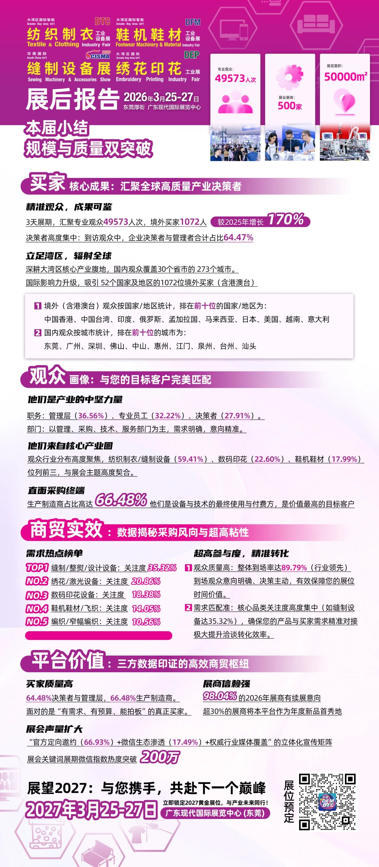 明年再会!2027 大湾区制衣制鞋・绣花印花工业设备展暨华南国际缝制设备展,期待与您相约东莞厚街,共赴智造新征程!