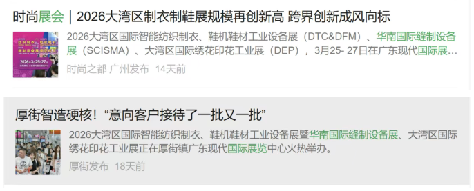 3 月 25-27 日,为期三天的 2026 大湾区制衣制鞋・绣花印花工业设备展暨华南国际缝制设备展(DTC、DFM、DEP、SCISMA)在东莞厚街广东现代国际展览中心圆满落下帷幕。作为华南地区开年首展,本届展会以 "智造生态・链接全球" 为主题,四大展会联动发力,打造了一场规模空前的行业盛宴,吸引全球500 + 品牌集结,接待近49573人次专业观众,境外买家1072人,展览面积5 万平方米,近200 件前沿新品集中首发,为纺织制衣制鞋绣花印花产业生产革新注入强劲动能。