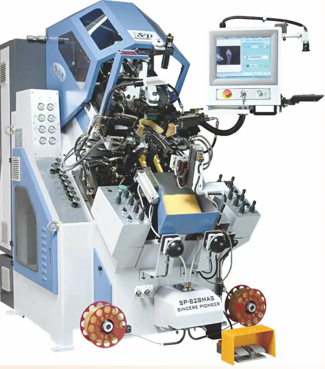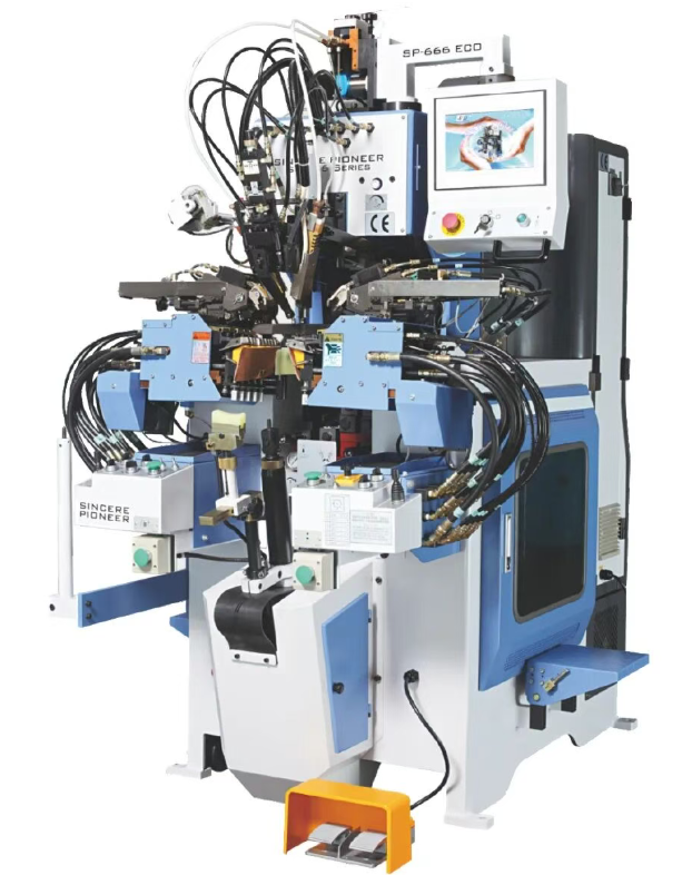 东莞市诚锋机械有限公司 AE20 SP-828MAS 视觉轨迹设定五轴伺服控制前帮机 1、视觉轨迹五轴伺服胶笔擦胶方式,省去更换胶盘时间与成本。 2、伺服马达控制送胶量·节省胶量亦可解决溢胶、铲胶不完全状况。 3、视觉照相形成轨迹:中底板经拍照后立刻转换成擦胶轨迹并能快速级放全套左右脚尺码。 4、IPC工业计算机搭配15吋彩色触控荧幕,采图形化操作界面。 5、可记忆储存2000组鞋型参数。 SP-666ECO 四轴伺服控制上胶中后帮机 1、基于大数据分析,系统整合男鞋、女鞋、运动鞋、窄腰足球鞋与登山鞋等五种常见鞋型,内建预设胶路与结帮参数,可快速套用或编辑,大幅缩短量产在线更换型体时间,提升生产效率与弹性。 2、仅需教导一个鞋码的擦胶轨迹,系统即能自动生成全尺码对应胶路,约2分钟内完成,操作简单直觉。 3、送胶可分三段控制,每段胶量皆可独立调整并具数字依据,调整快速、精度高,是目前最精准的送胶技术之一。 4、全球唯一采油压+气压双动力指压结构 展会期间推出新品企业一览